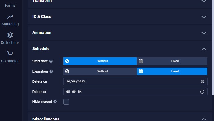 On the ‘About’ page within site ID 193047, there is a list of employees. If, for example, an employee gives notice that they intend to leave the role in two weeks, we set their block to expire at that time. This is set on the block contains the employee name, photo, title and email. Once we come back to check if it worked (or the client asks why they are still on the website), we find that the block is still there in the editor and on the live site, and the schedule seems to have gotten reset. The same happens when someone is hired and doesn’t start for a few days, so we schedule the block to go live, but it never shows on the live site. (We are using the .preset-boxes-grid-v3-default for this specific example. but we have experienced this with events we have tried to hide on site ID 246300.)